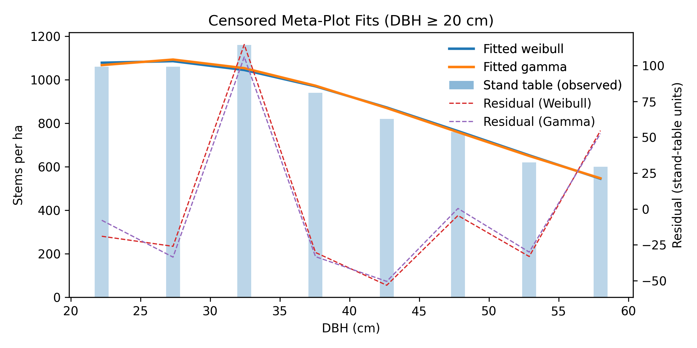 Figure 2 — Censored (DBH ≥ 20 cm) stand-table data with fitted Weibull and Gamma curves using the two-stage workflow. Residual lines highlight the agreement on the truncated support.