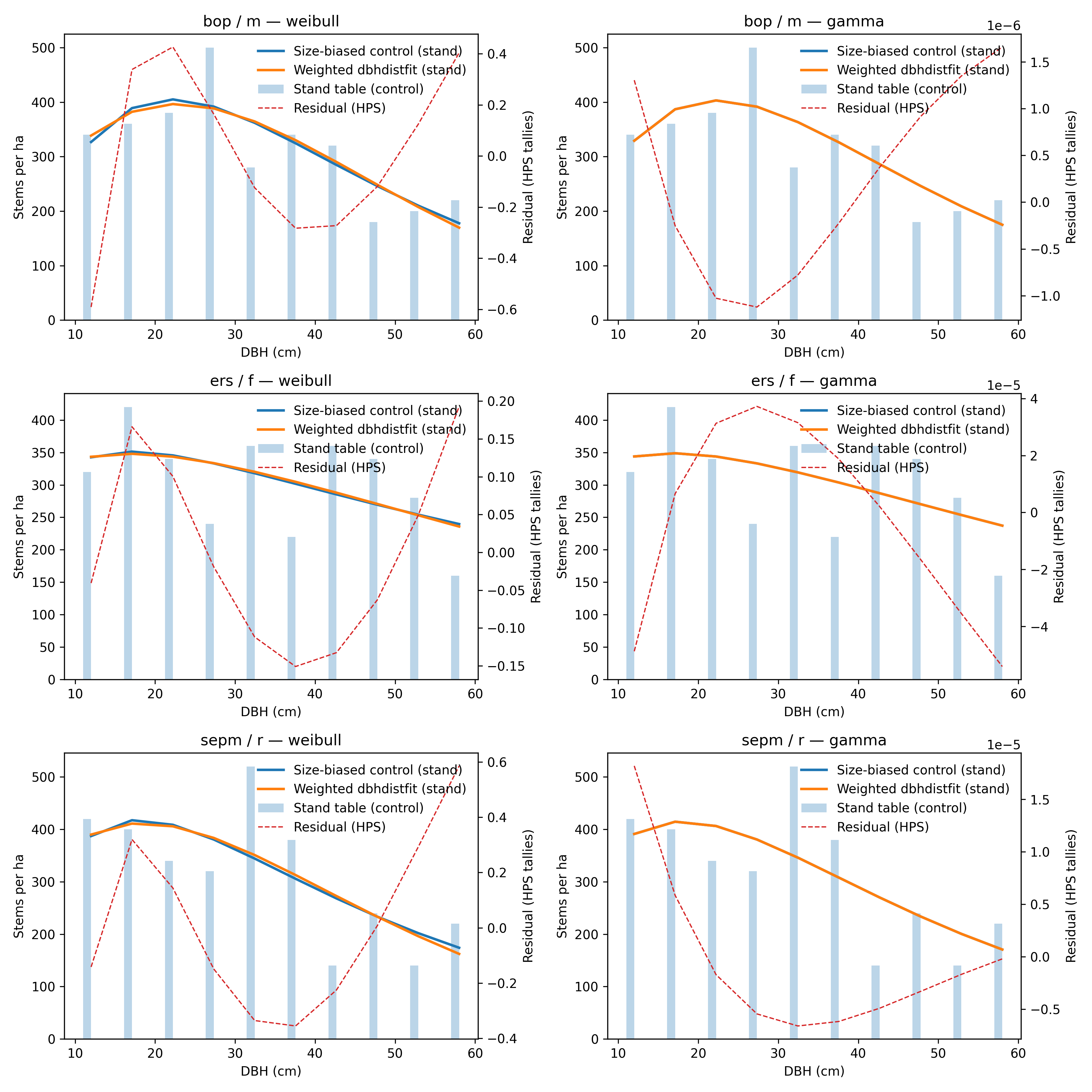 result.gofmetrics (RSS, AICc when available) across candidates.Plot the empirical stand table alongside fitted curves to confirm agreement with the manuscript workflow.